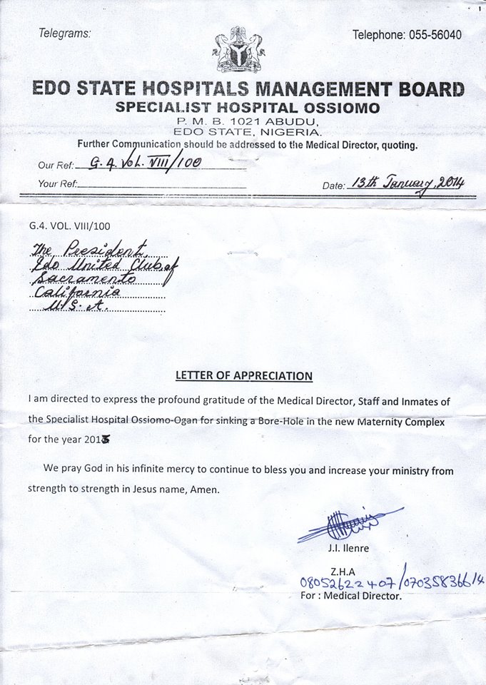 The Edo United Club of Sacramento successfully completed a borehole project at Ossiomo Specialist Hospital in Edo State. This project will help to provide potable water and facilitate health care treatment to the impoverished community in Edo State.